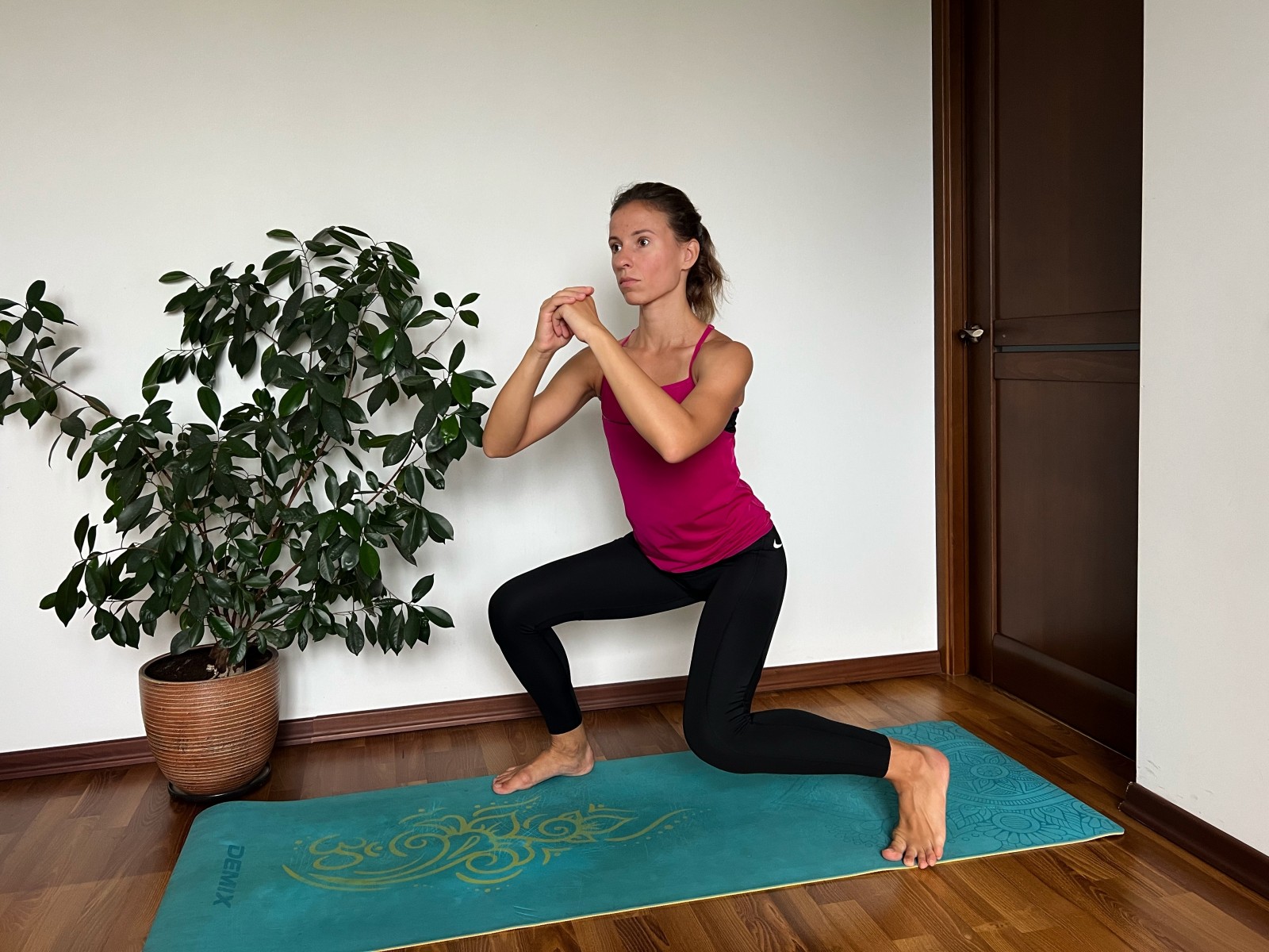 עמדו בפיסוק רחב, כפות רגליים פונות החוצה. בשאיפה כרעו לכריעה קדמית על רגל ימין. במקביל הפנו את כף רגל שמאל כלפי מעלה והורידו את הישבן נמוך ככל האפשר. שמרו על גב ישר ללא הטייה קדימה. בנשיפה חזרו לתנוחת המוצא וחזרו על הצד השני. בצעו 10-12 חזרות לכל צד.